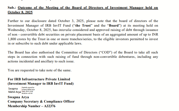 IRB Infrastructure Investment Trust (IRB InvIT) has approved raising up to ₹1,800 crore through the issue of non-convertible debentures (NCDs) on a private placement basis. The fundraise, cleared by the Board/Investment Manager, gives the InvIT flexibility to tap the debt market in multiple tranches depending on market conditions and refinancing needs.